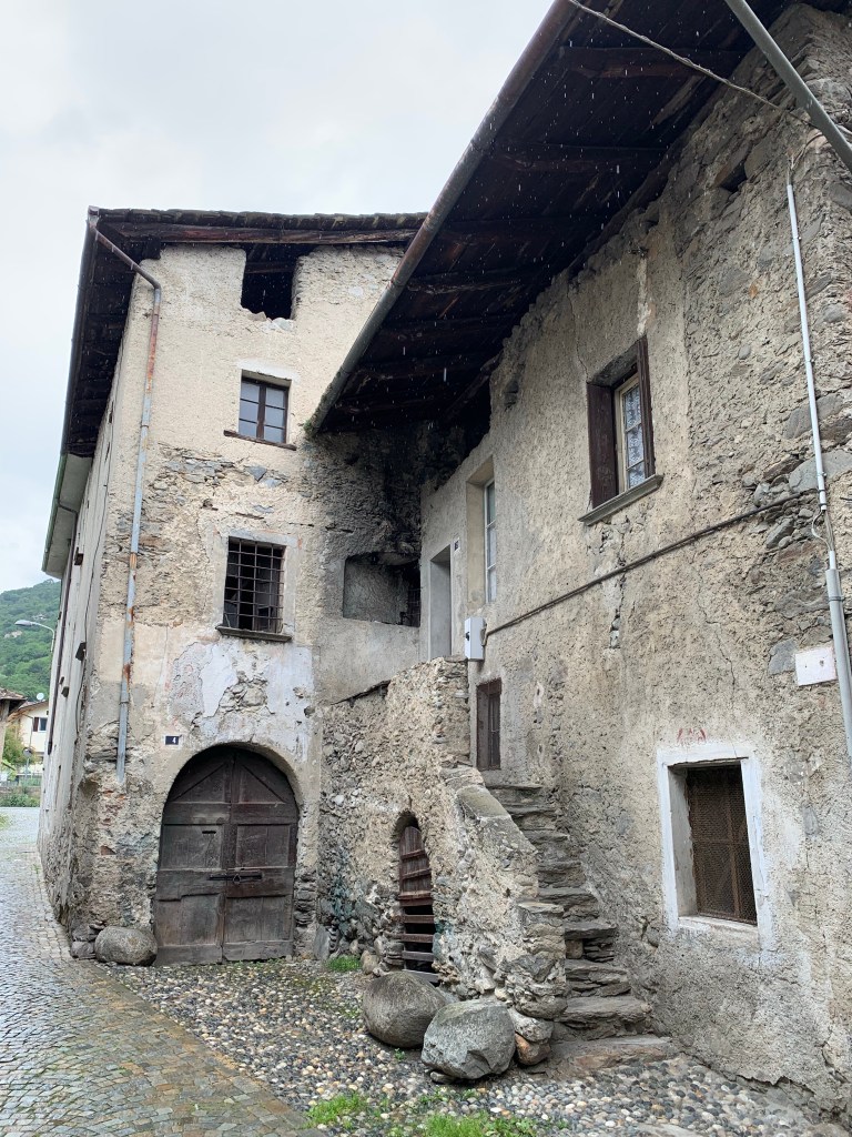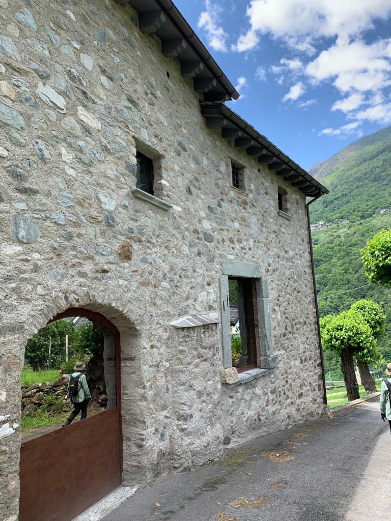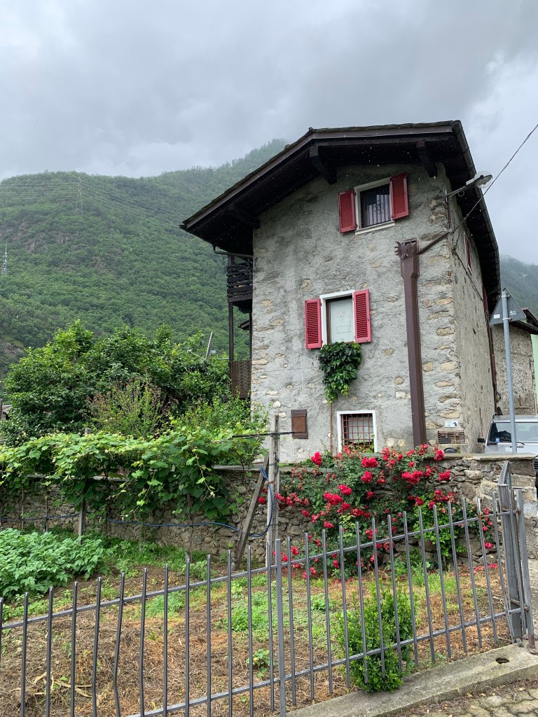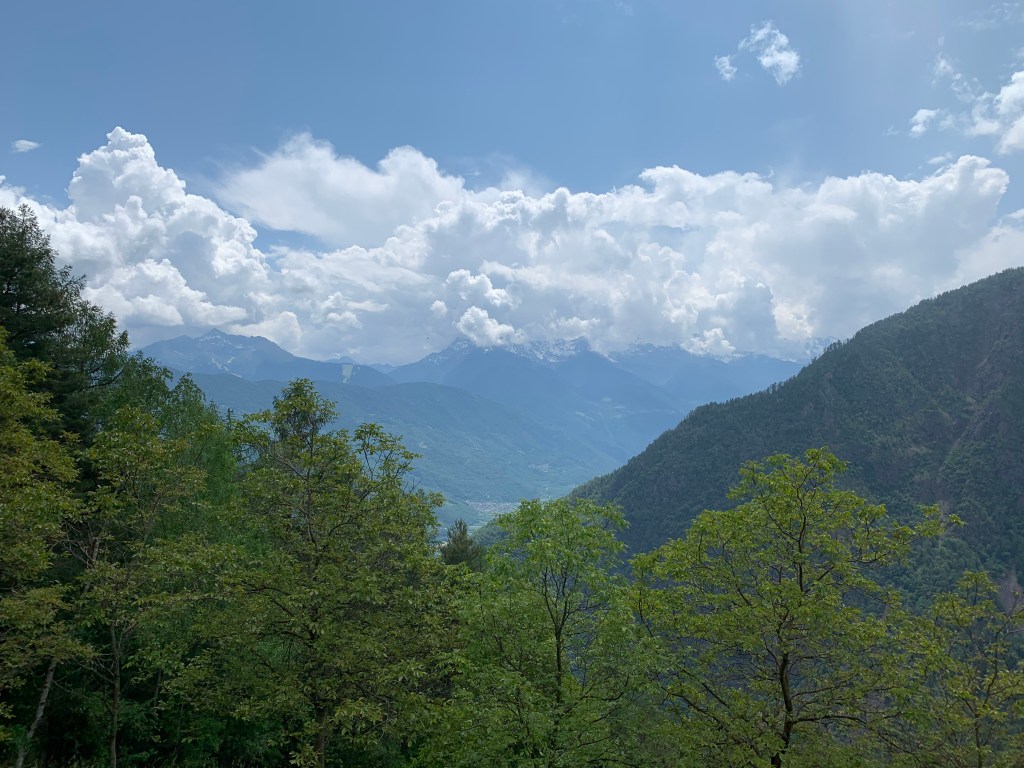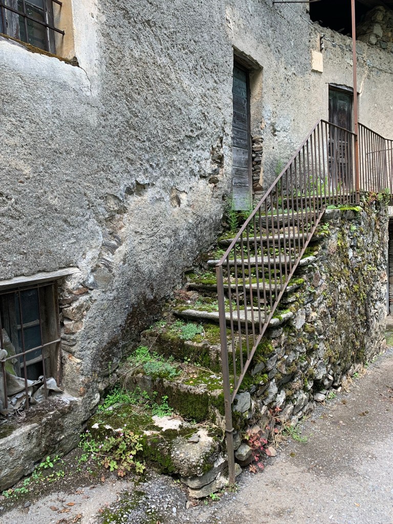 Watching the whispy clouds floating across the valley and swallowing up the snow capped mountains whilst savouring that first coffee of the day inspired us to walk right up into the middle of them. Heading straight up through the vineyards our first stop was Baruffini, one of the four hamlets of the Municipality of Tirano and located 800 metres above sea level. The immediate steep ascent up was beautiful but very hot once the sun broke through the clouds. Talk about getting our elevations up!