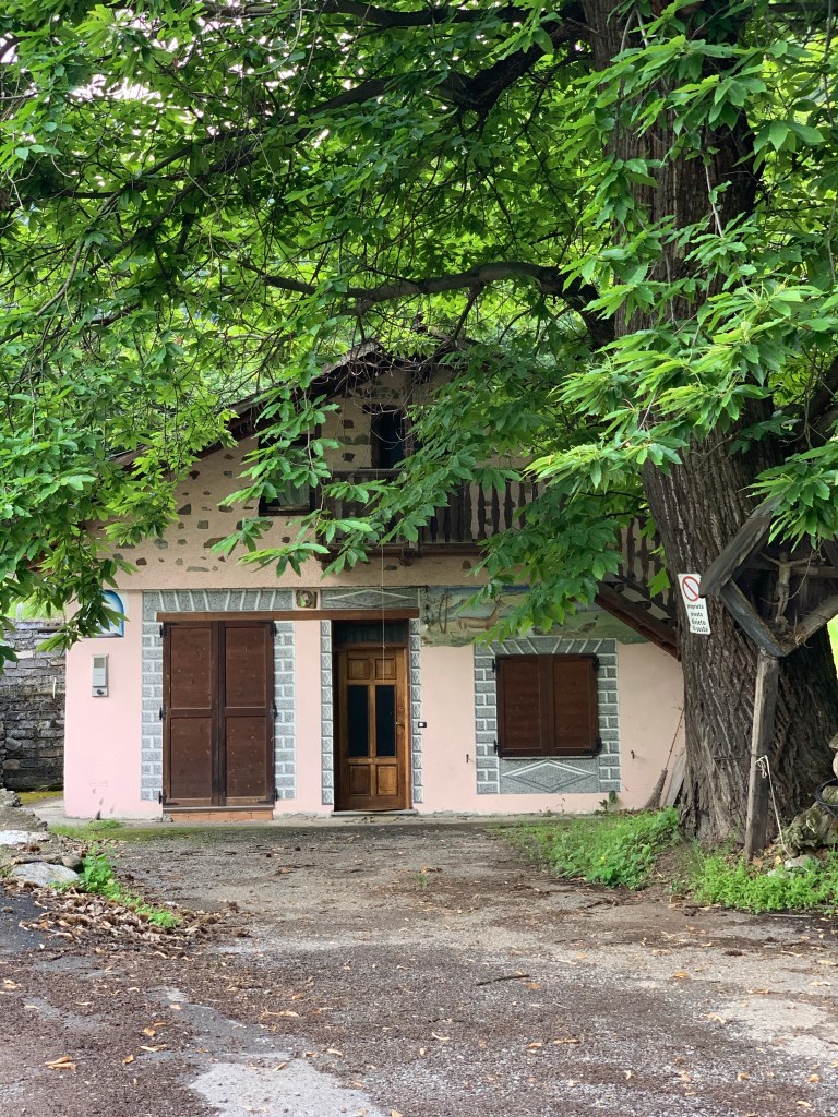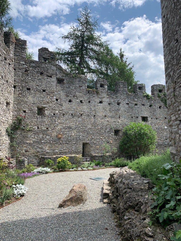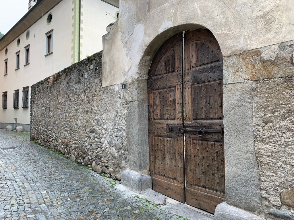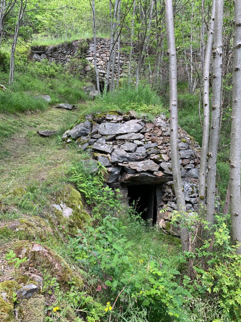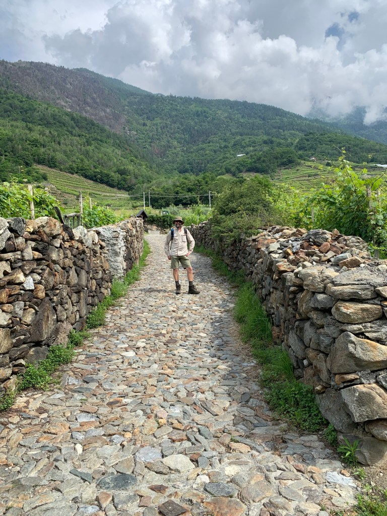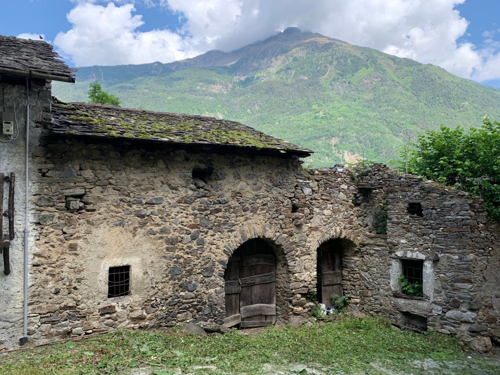 Watching the whispy clouds floating across the valley and swallowing up the snow capped mountains whilst savouring that first coffee of the day inspired us to walk right up into the middle of them. Heading straight up through the vineyards our first stop was Baruffini, one of the four hamlets of the Municipality of Tirano and located 800 metres above sea level. The immediate steep ascent up was beautiful but very hot once the sun broke through the clouds. Talk about getting our elevations up!